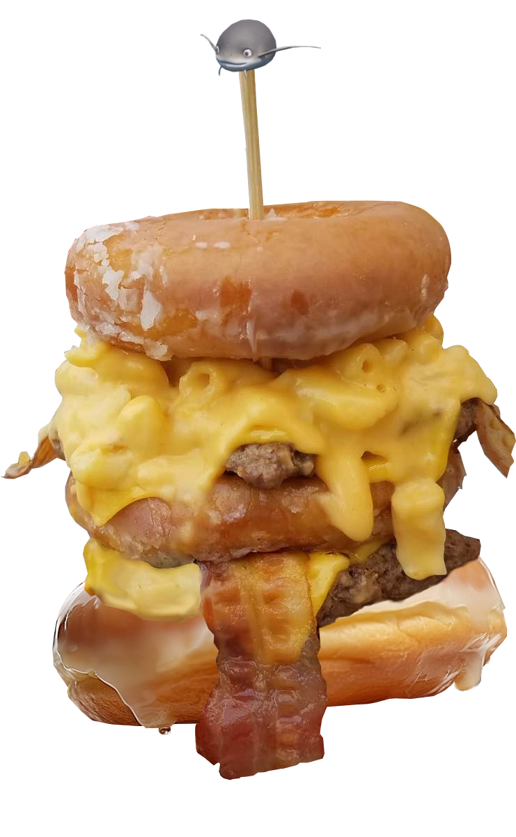 Two all-beef patties smothered in melted cheddar then topped with mac n' cheese and applewood smoked bacon. Warmed glazed donuts for buns. Yes, donuts.